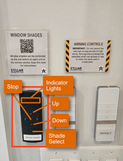 • The remote control, located in the kitchen between the window and the patio door, can be used to control each window shade independently.