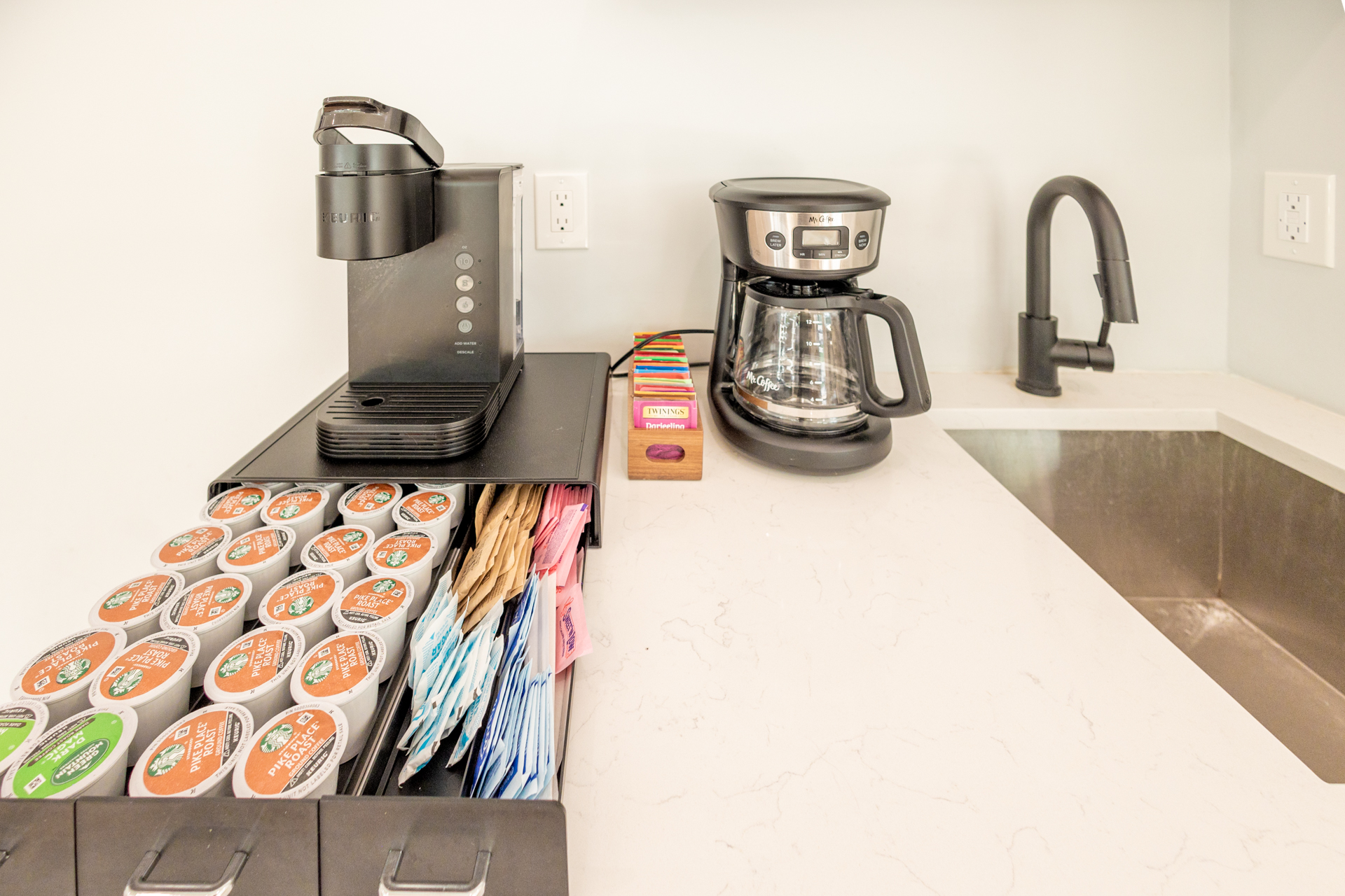 • Coffee station with Keurig (complimentary k-cups and sugars provided), drip coffee, and tea.