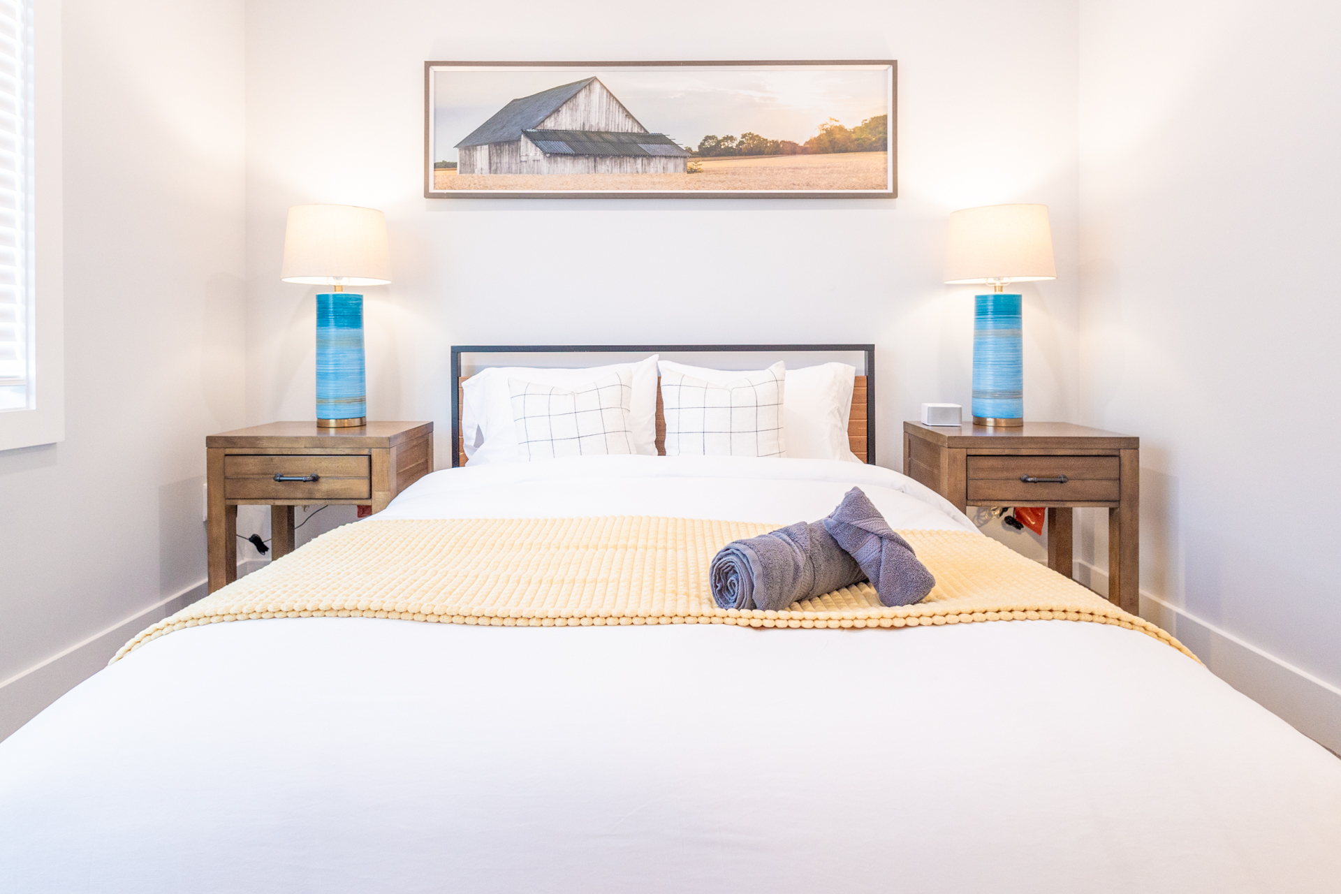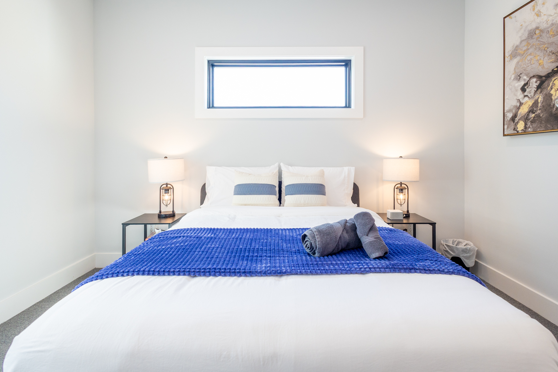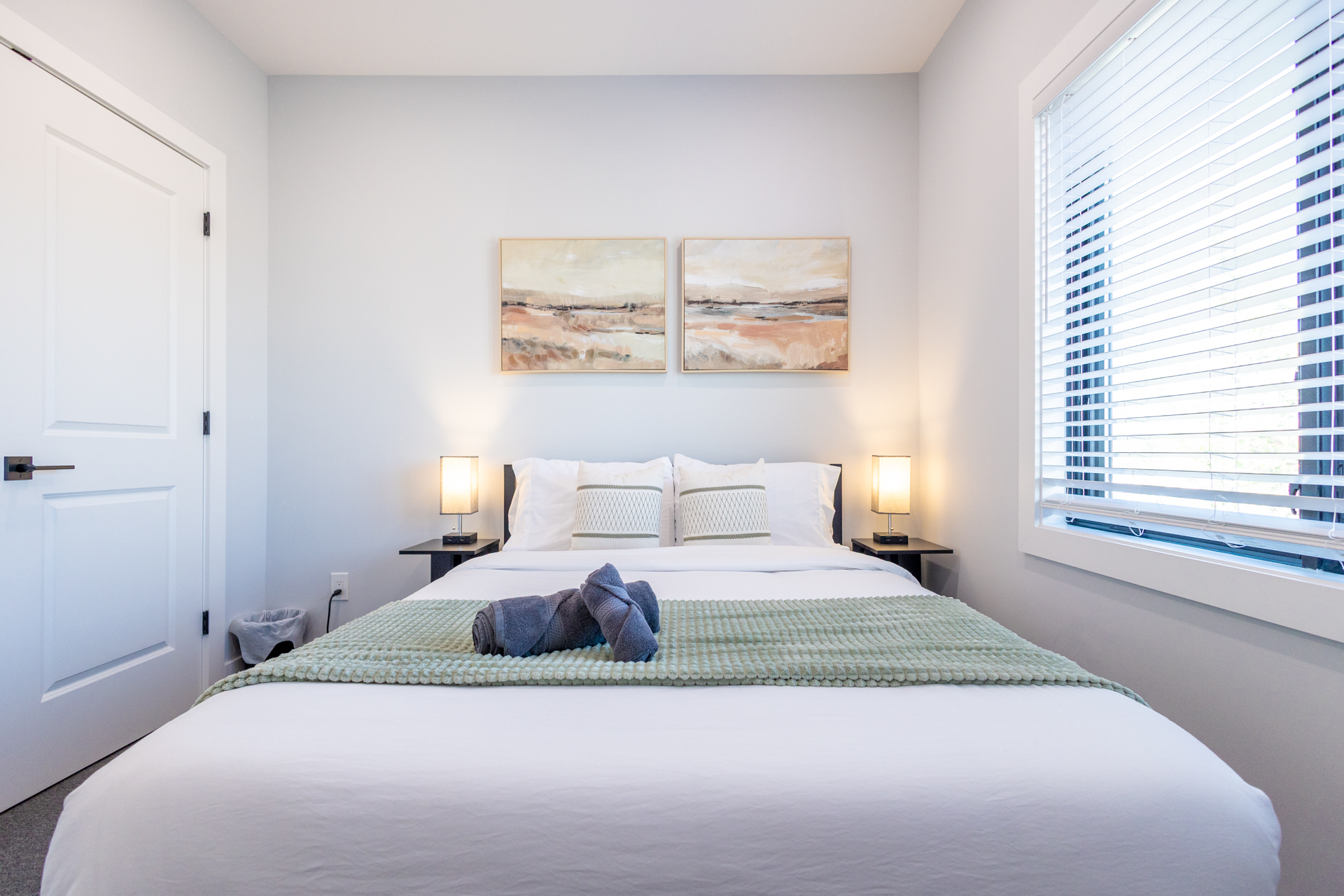 • Master bedroom: king bed, ensuite bathroom, and a large walk-in closet.